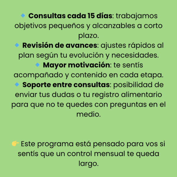 La CONSULTA es MENSUAL, pasado el primer mes realizaremos otra consulta y ajustaremos el plan según los AVANCES logrados (incluye la adaptación del plan a los 15 días).